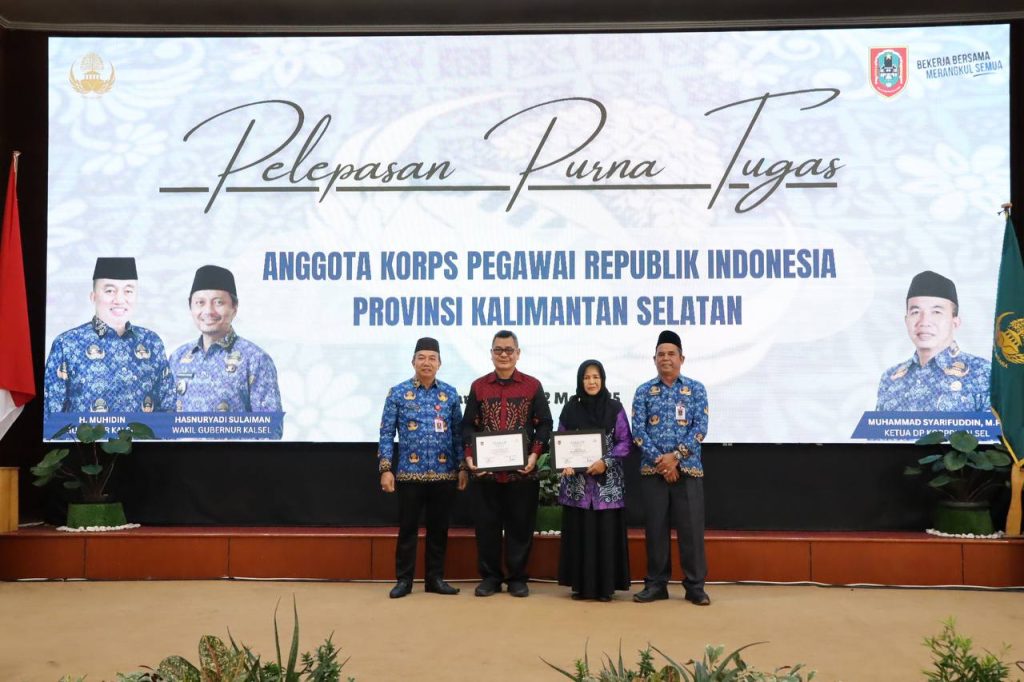 BANJARMASIN – Sebanyak 44 Aparatur Sipil Negara lingkup Pemerintah Provinsi Kalimantan Selatan mengikuti Pelepasan Purna Tugas anggota Korps Pegawai Republik Indonesia Provinsi Kalimantan Selatan di Gedung Mahligai Pancasila Banjarmasin, Jumat (2/5/2025).